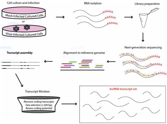 lncRNA identification workflow [107]. Workflow for identifying long non-coding RNA (lncRNA) transcripts from cultured cells. Starting with cell culture and infection (mock- or virus-infected), RNA is isolated, followed by library preparation and next-generation sequencing. Reads are aligned to a reference genome, and transcripts are assembled and filtered to remove coding transcripts, select those >200 bp, and assess coding potential, resulting in a set of lncRNA transcripts.
