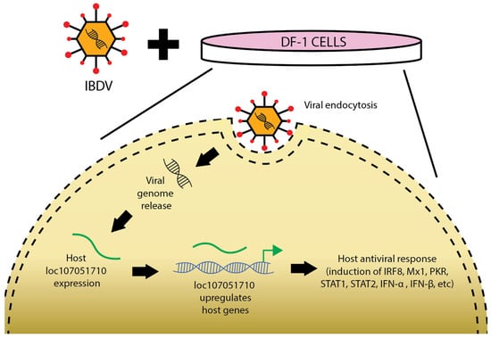 Action of IBDV-induced lncRNAs under in vitro conditions [137]. This diagram depicts the infection process of infectious bursal disease virus (IBDV) in DF-1 cells. The virus binds to the cell surface and enters through endocytosis. Inside the cell, the viral genome is released, leading to expression of the host gene loc107051710. This gene upregulates other host genes, triggering an antiviral response that includes the induction of IRF8, Mx1, IFN-γ, PKR, STAT1, STAT2, IFN-α, and IFN-β.