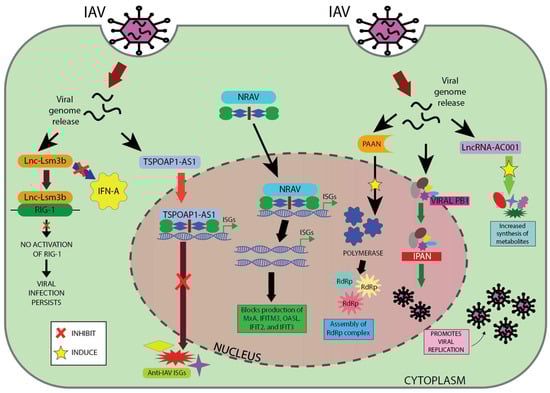 By blocking various stages of the host immune response, lncRNAs can also function as positive regulators of viral infection, according to the research performed by Ma et al. in 2016 [139]. One study by Ouyang and colleagues in 2014 [140] demonstrated how lncRNA NRAV is significantly downregulated during IAV infection. NRAV likely inhibits the initial transcription of various significant ISGs, such as MxA and IFITM3, by altering the histone modifications H3K4me3 and H3K27me3 in these genes. This, in turn, can promote IAV replication (Figure 3). A few such examples, with lncRNA regulating influenza virus replication, are mentioned in Table 1 [13,141,142].
