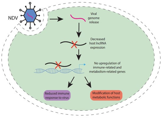 Action of lncRNAs in NDV infection [121,122]. This image illustrates the mechanism by which Newcastle disease virus (NDV) infection affects host cellular processes. Upon viral genome release into the host cell, there is a decrease in host lncRNA expression. This leads to no upregulation of immune-related and metabolism-related genes, resulting in a reduced immune response to the virus and modification of host metabolic functions.