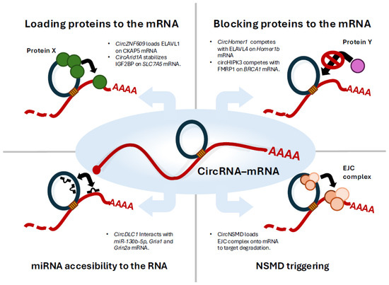 The functional outcomes of circRNA-mRNA interactions appear to be highly context-dependent (Figure 1, Table 2). In some cases, increased sequence complementarity or the loading of exon junction complexes onto the mRNA can trigger nonsense-mediated decay (NMD). In contrast, other interactions may sterically block destabilising proteins such as FMRP1 or facilitate the recruitment of stabilising proteins like ELAVL1, thereby enhancing mRNA stability and translation. Moreover, we should reconsider the classical sponging mechanism. Classically, circRNAs can modulate the availability of miRNAs and proteins through sponging effects, avoiding the accessibility of these factors to the mRNA. However, the introduction of circRNA-mRNA interactions adds another regulatory layer, potentially increasing the local availability of these factors near specific mRNAs.