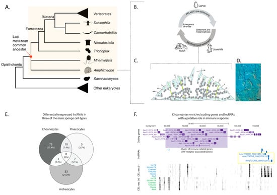 Porifera (sponges) are one of the oldest surviving phyletic lineages of animals, diverging from other animals around 700 Mya []. As such, they are an informative lineage for understanding the origin and evolution of animal lncRNAs. Traits shared between sponges and all other animals likely reflect shared inheritance from their last common ancestor (Figure 1A). Sponges consist of four classes—Demospongiae, Calcarea, Homoscleromorpha and Hexactinellida [,,]—of morphologically-simple animals (they lack true gut, nerves and muscles) that share a common body organization and appear to have diverged from each other over 650 Mya [] (Figure S1). They possess an internal network of canals and ciliated choanocyte chambers lined with epithelial cells, primarily endopinacocytes and choanocytes, and are separated from the external environment by another epithelial layer, the exopinacoderm. Choanocyte chambers pump water through this internal aquiferous canal system, drawing food into the sponge. Between the internal and external epithelial layers is the collagenous mesohyl, which is enriched with multiple types of amoebocytes, including the pluripotent stem cell type—the archeocyte. This juvenile body plan is the outcome of the dramatic reorganization of the radially-symmetrical, bi- or trilayered larva at metamorphosis [,,] (Figure 1B–D).