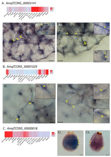 The previously characterized long intergenic ncRNA (lincRNA) AmqTCONS_00001029 is a 526-nt transcript encoded by three exons, expressed from chamber (late postlarval) to adult stages [] (Figure 2B). In contrast to AmqTCONS_00003141, its transcripts were detected in epithelial cells—endopinacocytes—that line the internal network of canals (Figure 2Bi,Bii’).
