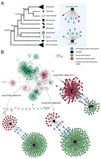 Previous findings have shown that Amphimedon and Sycon lncRNAs are co-expressed with similar sets of protein-coding genes [,], suggesting that, despite showing no apparent homology with any known animal lncRNAs, sponge lncRNAs may operate in evolutionarily conserved developmental modules (or networks) (Figure 3A).