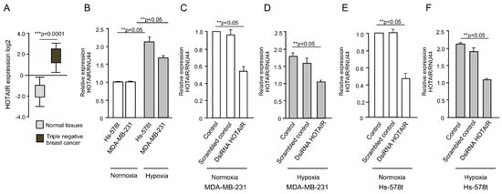 Expression of HOX transcript antisense RNA (HOTAIR) in breast tumors and HOTAIR silencing in breast cancer cell lines. (A) Expression of HOTAIR in healthy tissues (n = 99) and triple negative breast tumors (n = 217) from The Cancer Genome Atlas (TCGA) data using cBioPortal; (B) qRT-PCR assays showing the expression of HOTAIR in MDA-MB-231 and Hs-578t cells in normoxia and hypoxia conditions; (C–F) qRT-PCR assays showing the HOTAIR levels in HOTAIR-silenced cells using the DsiRNA HOTAIR inhibitor (35 nM) in normoxia and hypoxia conditions in (C,D) MDA-MB-231, and (E,F) Hs-578t cells. RNU44 was used as endogenous normalizer. Assays were performed three times by triplicate and data were expressed as mean ± S.D. ** p < 0.05; *** p < 0.0001.