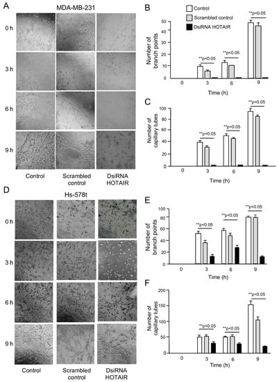 To investigate the functional role of HOTAIR in vasculogenic mimicry, we performed knockdown of HOTAIR expression using a specific validated siRNA (hereafter named as DsiRNA HOTAIR inhibitor). The data showed that HOTAIR expression was significantly (p < 0.05) downregulated in DsiRNA HOTAIR inhibitor (30 nM) transfected cells as compared with non-transfected control and scrambled control in MDA-MB-231 (Figure 1C,D) and Hs-578t (Figure 1C,F) cells growing under normoxia and hypoxia conditions. Then, we evaluated the effect of HOTAIR silencing in 3D channel-like formation, representative of the early stages of vasculogenic mimicry. MDA-MB-231 and Hs-578t cells were grown under hypoxia for 48 h, placed over matrigel, and incubated for a further 0, 3, 6, and 9 h to track the development of 3D capillary-like networks. Our results showed that the non-transfected (Figure 2A, left panel) and scrambled control (Figure 2A, middle panel) MDA-MB-231 control cells exhibited vasculogenic mimicry-related networks after 3 h and 6 h grown in matrigel, which were increased at 9 h. Interestingly, knockdown of HOTAIR resulted in a dramatic inhibition of 3D cell networks (Figure 2A, right panel). A significant reduction in the number of branch points and capillary-like tubes (up to 95%) as compared with non-treated and scramble transfected control cells was found (Figure 2B,C). There were no changes in cell viability found at the tested concentration of DsiRNA HOTAIR inhibitor, indicating the impact in vasculogenic mimicry inhibition was not due to unspecific effects in cell survival of cancer cells. To confirm these findings, we also analyzed the metastatic and triple negative Hs-578t breast cancer cells. The results showed that the Hs-578t cells efficiently developed hypoxia-induced 3D channels formation after 6–9 h of incubation on matrigel (Figure 2D). Likewise, silencing of HOTAIR leads to a significant inhibition of vasculogenic mimicry as compared with the controls, although to a less extent than found in MDA-MB-231 cells (Figure 2D, right panel). A significant reduction in the number of branch points and capillary-like tubes as compared with the non-treated and scramble transfected control cells was observed (Figure 2E,F).