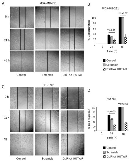 The inhibition of HOTAIR decreases cell migration in breast cancer cells. Scratch/wound-healing assays in (A,B) MDA-MB-231 and (C,D) Hs-578t cancer cells treated with DsiRNA HOTAIR inhibitor (right panel), scramble (middle panel), and non-transfected control (left panel). Cell migration was documented for 0, 24, and 48 h. The graphical representation of the migration is shown in (B) for MDA-MB-231 and in (D) for Hs-578t. Experiments were performed three times by triplicate and data were expressed as mean ± S.D. ** p < 0.05 and *** p < 0.001.