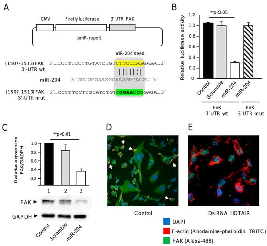 FAK is a novel target of miR-204. (A) pmiR-LUC-FAK plasmids showing the seed region for miR-204 in the 3′UTR of wild type and mutated FAK sequences; (B) Firefly luciferase activity assays in MDA-MB-231 cells co-transfected with wild type and mutated pmiR-LUC-FAK plasmids and miR-204 mimics; (C) Western blot assays FAK protein in MDA-MB-231 cells treated with miR-204 mimics (lane 3), scramble (lane 2), and non-transfected control (lane 1); (D,E) Immunofluorescence and confocal microscopy assays using anti-FAK antibodies (Alexa-488, green channel), rhodamine-phalloidin (TRITC, red channel) for cytoskeleton staining, and DAPI for nuclear DNA staining (blue channel) in MDA-MB-231 cells treated with (E) DsiRNA HOTAIR and (D) non-transfected control. Experiments were performed three times by triplicate and data were expressed as mean ± S.D. ** p < 0.05.