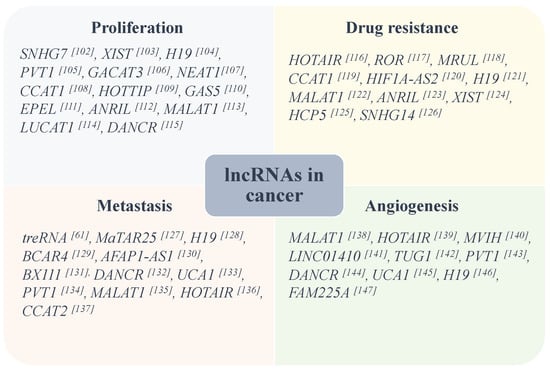Some lncRNAs are identified to be involved in aggressive characteristics of some common types of cancers [61,102,103,104,105,106,107,108,109,110,111,112,113,114,115,116,117,118,119,120,121,122,123,124,125,126,127,128,129,130,131,132,133,134,135,136,137,138,139,140,141,142,143,144,145,146,147].