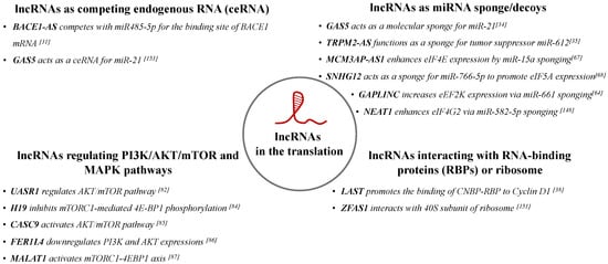 In this review, we aim to discuss the role of lncRNAs in the regulation of protein translation by controlling translational factors and signaling pathways. Furthermore, because translational regulation is often dysregulated in cancer cells, we also briefly summarize the role of lncRNAs in tumorigenesis and cancer progression as tumor promoters or tumor suppressors.