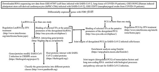 The overall approach to identify the joint targets of lncRNA and TFs deregulated in SARS-CoV-2 infected cells by using diverse publicly available resources is shown in Figure 1.