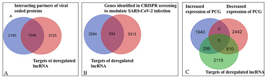 Common proteins among host interacting partners of SARS-CoV-2 coded proteins and targets of deregulated lncRNA (A), (B) represents the common proteins among genes/proteins identified to modulate SARS-CoV-2 infection and targets of deregulated lncRNA. (C) represents common PCGs altered in SARS-CoV-2 infected cells or in tissues from COVID-19 and targets of deregulated lncRNA.