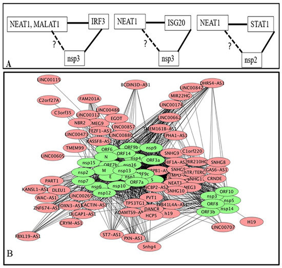 Viral proteins interact with host proteins to manipulate the host defense system, as well as the growth and replication of the virus. Interaction of lncRNA with the DNA/chromatin, mRNA, miRNA, and protein is known [98]. In the absence of information on interactions of lncRNA directly with a viral protein, we attempted to find out whether lncRNA interacting partners were also targets of viral proteins. About 5000 host proteins are the target of 30 SARS-CoV-2 coded proteins (Table S16). For example, viral E and M protein interact with 867 and 1615 host proteins respectively. Among the lncRNA interacting protein/gene (3228), 1048 genes/proteins were common with viral interacting proteins (Figure 4A), a viral protein targets many host proteins and a host protein may be the target of many viral proteins (Tables S17–S19). These common proteins interact with the SARS-CoV-2 coded proteins. Cytoscape representation of the interactions of lncRNA interacting proteins with the vital proteins is shown in the Figure S3. We combined the interactions of lncRNA with host proteins (Figure 2) and Figure S3 to obtain possible interactions of lncRNA with viral proteins. For example, IRF3 was a target of MALAT1 and NEAT1; non-structural protein nsp3 of SARS-CoV-2 could also target IRF3 [119]. This interaction was conserved in other corona viruses also [120]. NEAT1 interacts with interferon-stimulated gene ISG20 which is also a target of ORF9b (BioGRID). STAT1 is a target of MALAT1 that is also a target of nsp2. STAT6 is a common interacting partner of MALAT1 and NEAT1 as well as viral coded protein nsp9 (Figure 5A). Thus, MALAT1 and NEAT1 may interact/localize with IRF3, NEAT1 may interact with nsp3 and nsp3. Cytoscape representation of lncRNA with SARS-CoV-2 coded protein is shown in Figure 5B and summarized in Figure S3. This result shows that lncRNA could co-localize/interact with host proteins associated with the viral coded proteins and might modulate the function of host proteins. It remains to be found out how lncRNA contributes to the interaction of viral proteins with host proteins and modulates the functions of the host after infection of SARS-CoV-2.