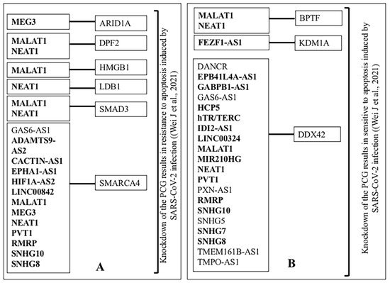 Representative result of CRISPR screening data from [106] is shown. Effects of knockdown of interacting partners of deregulated lncRNA in SARS-CoV-2 infected cells. Horizontal lines connecting two boxes indicate the interaction. LncRNA in bold face represents the increased expression in SARS-CoV-2 infected cells, (A): resistance to apoptosis, (B): sensitive to apoptosis. The same lncRNA interacting with different PCG might act as pro-viral or antiviral.