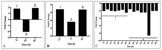 Representative result of changes in the expression of lncRNA NEAT1 (A), MALAT1 (B) and DANCR (C) at different time points by treatment with IFN-I (denoted by I) and IFN-II (denoted by II) as obtained from Interferome database (http://www.interferome.org/interferome/home.jspx, accessed on 1 July 2021).