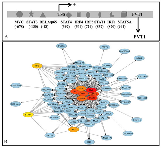 (A) (top panel): Binding of TFs to the putative promoter (−5 Kb to +1 Kb) of PVT1. Nine TFs IRF1 (binding positions 883 and 870 from the TSS), IRF4 (568, 564), IRF5 (724), MYC (933, 911, 862, 850, 832, 827, 824, 758, 711, 697, 455, 438, 434, 385, 365, 274, 191, 184, 163, 126, 98, 57, 45, 34, 31, 21, 20, 19, 3, −24, −54, −460, −617, −628, −678, −1454), RELA/p65 (974, 949, 932, 900, 894, 875, 863, 841, 831, 826, 806, 791, 679, 678, 677, 669, 657, 652, 652, 643, 633, 627, 626, 620, 612, 611, 603, 597, 596, 565, 341, 247, 18, −8), STAT1 (857,−4693), STAT3 (986, 844, 826, −130), STAT4 (397), STAT5A (941, 928) could bind to the putative promoter. Among the several binding sites observed from ChIPBase, only one site is shown in Figure. Positions indicate the distance from the transcription start site (TSS). Distances shown are not in scale. (B): (lower panel) Top ten interactions of TFs with lncRNAs represented by online software by Cytoscape. TF-Gene network being directional, the edges, connecting the nodes [TFs (shown in red and yellow filled ovals) and lncRNA (light blue)] are shown by arrows.