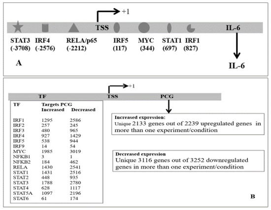 (A): Binding of different TFs at the putative promoter of IL-6 as obtained from ChIPBase. IRF1 (positions 994, 827, 713), IRF4 (−2576, −3246), IRF5 (117), MYC (878, 805, 738, 678, 676, 660, 646, 643, 636, 632, 613, 580, 494, 477, 344, −94, −2476), RELA (705, −2212), STAT1 (697, 490), STAT3 (987, 554, −3708) could bind to the putative promoter (−5Kb to +1Kb of the TSS). Only one of the binding sites of a TF is shown. Summary of the result obtained for all 16 TFs and 2133 upregulated genes and 3116 downregulated genes, where binding of at least one of 16 TFs was obtained is shown in (B). Detail result is shown in the Tables S28 and S29.