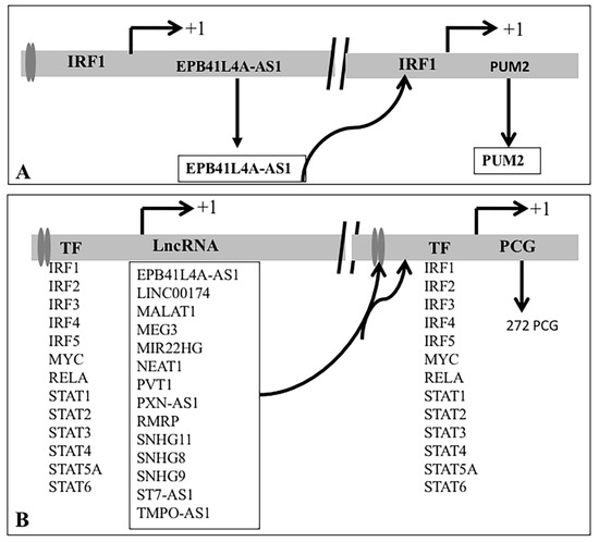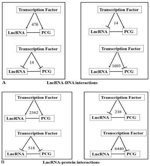 Complex molecular interactions of TF, lncRNA, microRNA, and other epigenetic changes control gene expression. In the simplest form, TFs bind to the regulatory sequences (promoters and enhancers) and activate or repress the expression of PCGs, microRNA, or lncRNA. A regulatory network is composed of a complex web of molecular factors that interact with each other and with genes in order to control gene expression. In the simplest form of gene-regulatory network, TFs bind to regulatory sequences and their interactions result in the induction or repression of the gene expression [85]. Introduction of post-transcriptional regulation of PCG by microRNA (Figure S1), a negative regulator of PCG results in the complex regulation of PCG and studied in detail by several investigators [86,87,88,89]. In such a mixed network of TF-microRNA-targets, several recurrent regulatory patterns can be detected, called network motifs, similar to that obtained with the TF-target network [90]. Among these motifs, microRNA-mediated feedforward loop (FFL), where TF regulates a miRNA and, together with it, a set of common target genes of TF and microRNA. Over-presentation of FFL in many regulatory networks supports the notion that it might play an important regulatory role. Depending on the ability to activate or repress the expression of the target PCG or microRNA, the FFL could be classified as coherent and incoherent. In the coherent FFLs, TFs could activate or repress both microRNA and the target PCG, while in the incoherent FFLs, expression of microRNA and PCG are in opposite directions (Figure S1) [91]. MicroRNA being a negative regulator of PCG, in coherent FFLs, the expression of microRNA and target PCG are highly anticorrelated (in opposite direction), while in incoherent FFLs expression of them are highly correlated (in the same direction). For example, in a coherent FFL TF induces the miRNA expression; the same TF represses the joint target PCG. This condition enforces mutually exclusive expression as the ones observed in several cases. Thus, microRNA can help the transcriptional repression of a target protein that should not be expressed in a particular cell type or condition acting as a post-transcriptional “failsafe” control. Incoherent FFL can promote high PCG expression in microRNA expressing cells, indicating that microRNA might have a “fine-tuning” function, maintaining the protein level in the appropriate functional range [92].