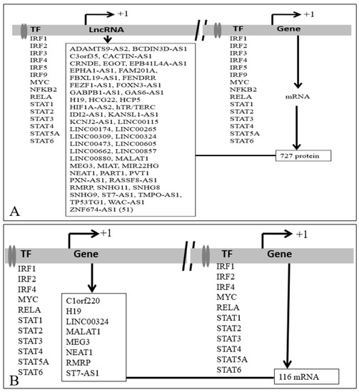 Long non-coding RNAs (lncRNA) are heterogeneous transcripts, longer than 200 nucleotides without the potential for coding proteins. Similar to protein coding genes (PCG), lncRNAs are also under transcriptional control of TF, chromatin modification, and promoter methylation. LncRNA interacts with chromatin, DNA, mRNA, protein, microRNA and modulates the levels of protein coding genes (PCG) at transcription, post-transcription, or post-translation levels. Interaction of lncRNA with DNA might result in DNA-RNA triple helices, facilitating or inhibiting the recruitment of transcription factors (TFs) and regulating expression of nearby genes (cis) or at distance (trans). Interactions of lncRNA with mRNA or protein may stabilize or destabilize the mRNA. Interaction of lncRNA with protein might alter the stability and localization of proteins and thus alter the expression of the genes when interacting with TF. Interaction with proteins involved in splicing might also indirectly level of mRNA. LncRNA has been implicated in diverse biological processes, functions, and pathways including transcription, mRNA splicing, apoptosis, immunity, inflammation by altering the level of proteins (reviewed in [25,26,27]).