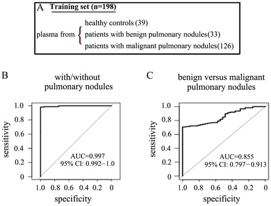Assay performance in detecting both the existence and the nature of pulmonary nodules in a training cohort. (A) Biospecimens used in the training cohort. Receiver operator characteristic (ROC) curves for prediction rules in detecting patients with/without pulmonary nodules (B) and patients with benign versus malignant pulmonary nodules (C).