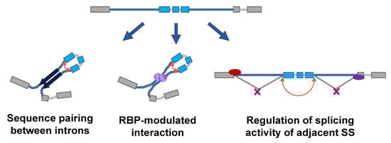It is known that circRNAs are transcribed from both the exonic and intronic regions of coding or noncoding genes [19,20,21,22]. Several genome-wide analyses reported that circRNAs originate from virtually any genomic locus, such as intergenic, intronic, coding region, 5′- and 3′-untranslational regions (UTRs) [23,24]. Despite the diverse loci/regions of origin, the majority of circRNAs are produced by the unique process termed ‘backsplicing’, in which a downstream splice donor joins an upstream splice acceptor with no preference for U2 or U12 spliceosome [5,25]. However, there are a few molecular properties/events favoring the occurrence of backsplicing. First, the exons flanked by large introns tend to be circularized [2,5,26,27] (Figure 1, top). Second, the repetitive sequences or any complementary sequences in the flanking introns would bring the downstream splice donor and upstream splice acceptor to a proximity, allowing the backsplicing to take place [5,9,28,29] (Figure 1, left). In an analogy, RBPs antagonizing complementary pairing hinder the efficiency of backsplicing, while RBPs favoring the interaction between flanking introns enhance backsplicing [30] (Figure 1, middle). Lastly, the lost/masking of the splice donor of the upstream flanking intron or splice acceptor of the downstream flanking intron also increases the frequency of backsplicing (Figure 1, right). The cells should respond to the external stimulation properly, and deregulated responses to cellular stresses typically cause the development of human diseases. In this mini-review, we would like to focus on the potential mechanisms underlying how cells modulate the process of backsplicing in response to or during the cellular stresses. The presentation of these lines of clues would help to bridge the external stimuli, backsplicing, and finally the biogenesis and functions of circRNAs, shedding light on the identification of potential targets for treating human diseases.