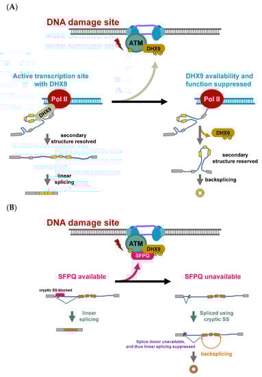 DNA damage poses a significant threat to the cells, and thus it is critical for cells to properly respond to the DNA damage. One of the early molecular events of DNA damage is mediated by phosphatidylinositol 3-kinase-related kinase (PI3KK) activation. In addition to DNA repair, the activation of PI3KK coordinates global transcriptional repression [31,32,33,34]. DExH-Box helicase 9 (DHX9), also known as RNA helicase A, is associated with active transcription machinery and is involved in resolving the secondary structure during active transcription [35,36] (Figure 2A, left), while its helicase activity negatively regulates the formation of circRNA [36]. Interestingly, DHX9 also plays important roles during DNA damage response and is associated with factors related to DNA damage [37,38] (Figure 2A, top). It was shown that the depletion of DHX9 using small interfering RNA decreases the levels of a few circRNAs [36], and thus, factors inhibiting DHX9 activity may potentially facilitate circRNA backsplicing. Intriguingly, DHX9 was post-translationally regulated by DNA damage-induced ATM/ATR activation [39,40] (Figure 2A, top and right), and the phosphorylation sites located adjacent to the RNA binding motif. This suppressive phosphorylation promotes the level of an oncogenic circRNA, CCDC66, which governs a subset of oncogenes contributing to the development of chemoresistance [7,40]. The aberrant induction of circRNAs is a feature of chemo-/radio-resistant colorectal cancer (CRC). It has been reported that a group of circRNAs was upregulated in fluorouracil/radio-resistant CRC consistent with the observation in oxaliplatin-resistant CRC [40,41]. In both platinum-based chemo-resistant gastrointestinal tract-derived tumors, the patients with higher levels of these circRNAs had a poorer prognosis, and the induction of the chemoresistance-regulated circRNAs contributed to the metastatic features of the tumors [7,40,42]. In agreement with the role of DHX9 in DNA damage response, DHX9 interacting partners, splicing factor proline/glutamine rich (SFPQ) and non-POU domain-containing octamer binding protein (NONO), were also recruited to the DNA damage site in an ATM-dependent manner [43] (Figure 2B). Functionally, SFPQ hinders the activity of the cryptic splicing signal, regulating the availability of the splicing signal for backsplicing [44]. The change of the subnuclear localization of SFPQ and NONO may alter their availability for regulating splicing. It has been reported that the absence/unavailability of SFPQ in the upstream intron of circularizable exons promoted the backsplicing efficiency of a particular circRNA with a long intron, but no proximal inverted Alu elements [44], implying that SFPQ may be involved in the regulation of genotoxic stress-induced circRNA biogenesis.
