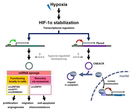 NAs such as cireZNF292, circAFF1 and circDENND4C have been identified (Figure 3, left). The upregulation of these genes is prone to result from the transcriptional activation, but not the alteration of backsplicing efficiency. Among these circRNAs, circZNF292 was shown to promote endothelial cell proliferation and sprouting through a non-miRNA sponging activity. An independent study using models of breast cancer also reported that the level of circDENND4C was upregulated by hypoxic stress, and was positively correlated to the HIF-1α mRNA level and tumor size [28], implying the importance of transcriptional activation by HIF-1α under hypoxia for circDENND4C induction. In spite of the uncharacterized molecular functions of these hypoxia-regulated circRNAs, a cardiac- necroptosis-associated circRNA (CNEACR) originating from exon 2 to 5 of Fbxw4 was identified from a mouse model of ischemia/reperfusion [56] (Figure 3, right). The level of CNEACR was downregulated by ischemia/reperfusion in mice, and the same pattern was confirmed in the cell culture system. The expression of CNEACR was specific to myocytes compared to fibroblasts, and resided more in cytoplasm than nuclei. The overexpression of CNEAR attenuated hypoxia/reoxygenation-induced cell death. It was observed that CNEAR interacts with histone deacetylase 7 (HDAC7) by using biotin pulldown assay and trapping HDAC7 in cytoplasm. Mechanically, the trapping of HDAC7, a transcriptional co-repressor, in cytoplasm relieved the suppression of Foxa2 and facilitated the induction of Foxa2-regulated receptor-interacting protein kinase 3 (RIPK3). This particularly widened the horizon regarding how circRNA may function in addition to miRNA sponges in physiological and pathological conditions. Nevertheless, it has been reported that circRNA may be used for inter-cellular communication by incorporation into exosomes [57,58]. Among these exosomal circRNAs, the level of circZNF91 was elevated by HIF-1α-mediated transcriptional activation, and was shown to antagonize the activity of miR-23b-3p, protecting SIRT1 mRNA from degradation and contributing the development of gemcitabine resistance [59].