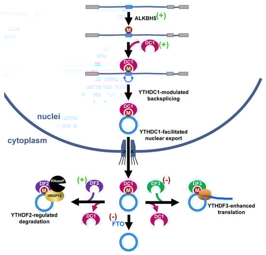 N6-methyladenosine (m6A), one of the most prevalent, abundant and conserved modifications identified in eukaryotic RNAs, was recently identified on circRNA [64,65] and serves as another link to hypoxia-regulated circRNA functions and homeostasis. The abundance of m6A is dynamically regulated by a dozen m6A methyltransferases, such as methyltransferase-like 3/14/16 [66,67,68], zinc finger CCCH-type containing 3 [69], RNA binding motif protein 15 [70], WT1-associated protein [71,72] and vir-like m6A methyltransferase-associated [72], and demethylases, fat mass and obesity-associated (FTO) and AlkB homolog 5 (ALKBH5) [73,74]. Different effectors/readers include YTH domain-containing family 1/2/3 (YTHDF1/2/3), YTH domain-containing 1/2 (YTHDC1/2), insulin-like growth factor 2 mRNA-binding protein 1/2/3 (IGF2BP1/2/3) and hnRNPA2B1 grant m6A multiple cellular/molecular functions. The deposition of m6A on circRNA differentially controls various molecular events such as nuclear export, degradation, biogenesis and translation by a distinct m6A reader [64,75,76,77,78]. For example, the deposition of m6A in exon followed by the recognition of YTHDC1 promotes the backsplicing of circZNF609 and nuclear export of circNSUN2 in nuclei, while recognition by YTHDF3 in cytoplasm increases translation [75,77] (Figure 4, top). Through recognition by a distinct m6A reader, YTHDF2, which works with heat-responsive protein 12 and RNase P, a subset of m6A-containg circRNAs, was destabilized [76]. Intriguingly, the expression of many m6A regulators was regulated by hypoxic stress. The expression of m6A demethylase, FTO, was suppressed by hypoxia [79], while the levels of ALKBH5, YTHDC1, YTHDF1 and YTHDF2 were upregulated [80,81,82,83,84] (Figure 4, indicated by (+) or (−)). Most of these cases were direct targets of the hypoxia-inducible factor, while YTHDF1 was post-transcription-ally regulated by hypoxia-induced miR-16-5p. These lines of evidence suggest that the hypoxia-regulated m6A dynamics may control functions of a subset of circRNAs. Along with the hypoxia-m6A-circRNA regulatory axis, circRNA also controls the level of HIF-1α. For example, it was reported that circERBIN promotes the expression of HIF-1α through upregulation of the cap-independent translation of HIF-1α by suppressing miRNAs targeting 4EBP-1 [85]. Taken together, this evidence highlights the critical roles of circRNA during hypoxic stress.