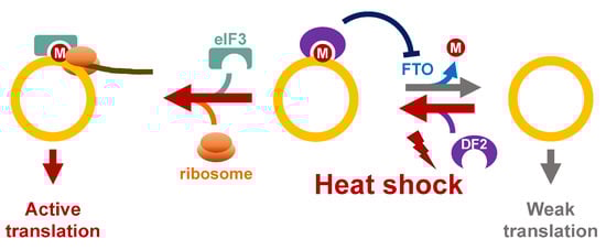 The heat shock response is well studied in aspects of both transcriptional and translational regulation. However, whether the functions or expression of circRNA are controlled under such circumstances remains largely unknown. Recently, the coding potential of circRNA has begun to receive more attention. One of the cap-independent translations of circRNA is mediated by m6A [77] (Figure 5). It has been reported that m6A reader—YTHDF2—translocates to the nuclei and protects the m6A within 5′-UTR of mRNA from FTO-mediated demethylation and promotes translation through the recruitment of eukaryotic initiation factor 3 (eIF3) in response to heat shock [86,87]. Consistent with the role of the m6A-stimulating cap-independent translation of mRNA, the m6A-mediated translation of circRNA is enhanced by heat shock [17,64], implying that YTHDF2 and/or eIF3 may be potential players for regulating the coding activity of circRNA under heat shock stress.