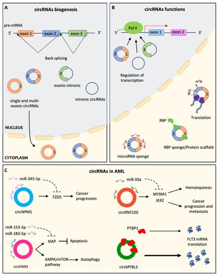 (A) circRNAs biogenesis. circRNAs are generated by unconventional splicing, named back-splicing, in which the 3’ end of an exon binds the 5’ end of an upstream exon, forming a covalently closed molecule. circRNAs can be divided into three main classes: single or multi-exonic circRNAs (on the left), which can translocate in the cytoplasm; exonic-intronic circRNAs (in the middle) and intronic-circRNAs (on the right), which are retained in the nucleus. (B) circRNAs functions. CircRNAs can regulate transcription, interacting with Polymerase-II (Pol II) in the nucleus. In the cytoplasm, they can act as microRNA sponges or RBP sponges, and they can also be translated thanks to the presence of an IRES or m6A modification. (C) circRNAs in AML. Representation of some circRNAs involved in AML progression: circNPM1 acts as miR-345–5p sponge, increasing FZD5 expression, a well-known oncogene; circPAN3, sponging miR-153-5p and miR-183-5p, leads to increased autophagy and inhibits apoptosis; circRNF220 induces MYSM1 and IER2, affecting hematopoiesis and promoting cancer progression and metastasis; circMYBL2 favors mRNA FLT3 translation by binding PTBP1.
