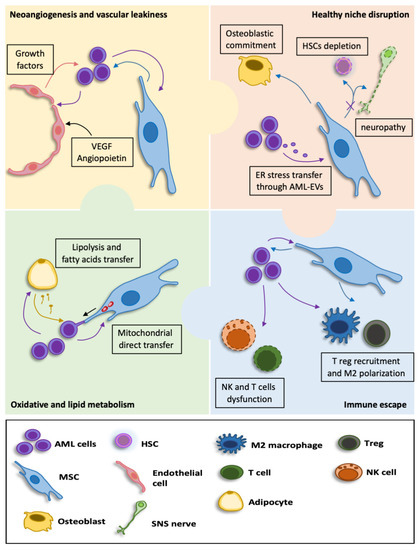 Interaction between AML cells and the bone marrow microenvironment. Within the niche, AML cells communicate with mesenchymal stem cells and endothelial cells in order to increase bone marrow vascularization and alter vascular permeability (yellow panel); Moreover, AML cells strongly reprogram MSCs, leading to a self-reinforcing niche at the expense of normal hematopoiesis (pink panel); Leukemic cells escape the immune system and recruit anti-inflammatory components such as Treg and M2 macrophages (light blue panel); AML cells exploit stromal cells to enhance their antioxidant defenses and adipocytes as a source of cellular energy (green panel).