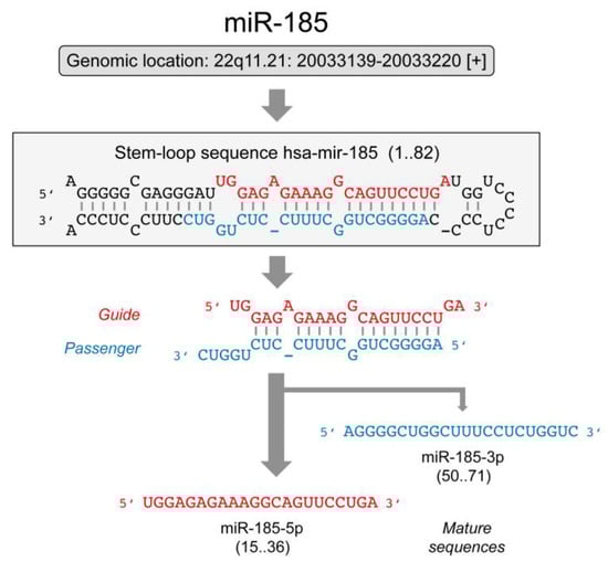 Schematic representation of miR-185 maturation. The gene is located on chromosome 22 (GRC genome assembly number: GRCh38.p14; gene ID: 406961). The stem-loop pre-miRNA, the duplex and the mature sequences are shown. Mostly, the red-labeled strand acts as guide. However, this does change in some instances. In consequence, two mature sequences exist. Sequences were downloaded from miRBase (www.mirbase.com; accessed on 21 September 2022) and the NCBI Gene Database (www.ncbi.nlm.nih.gov; accessed on 21 September 2022).