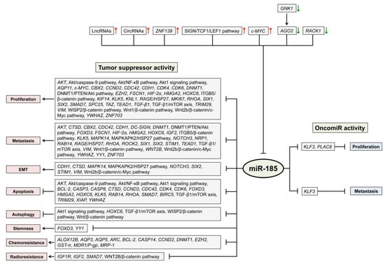 Dysregulation of miR-185 has been found in various pathological states, and there is much evidence for the misregulation of miR-185 in human cancers. The majority of experimental data indicates that miR-185 exhibits tumor-suppressive activities by affecting many critical biological processes such as cell cycle, epithelial-to-mesenchymal transition (EMT), apoptosis, autophagy, invasion and metastasis. However, fewer but nevertheless several studies have reported that miR-185 acts as an oncogene.