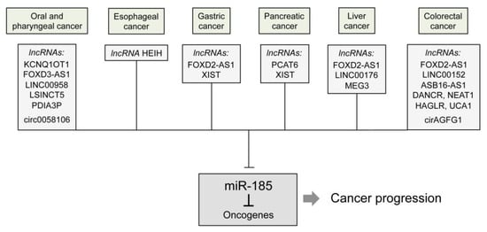 LncRNAs and circRNAs are shown which act as major upstream regulators of miR-185 in digestive tract cancers and drive cancer progression by suppressing miR-185.
