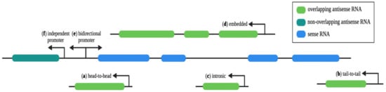 asRNA classification based on their genomic position and direction of transcription with respect to the sense genes. asRNAs are divided into two major categories: convergent overlapping asRNAs, which include (a) head-to-head, (b) tail-to-tail, (c) intronic and (d) embedded transcripts, and divergent non-overlapping asRNAs, which can (e) share a bidirectional promoter with their sense gene or (f) have an independent one. Created with BioRender.com accessed on 25 October 2022.