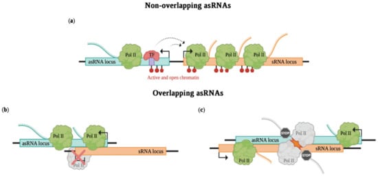 Transcription-dependent mechanisms of asRNAs. In the figure, the transcription-dependent modes of action of asRNAs are reported. In cases of non-overlapping asRNAs (a), the transcription or the binding of a transcription factor (TF) at the asRNA locus promote the transcription at the sense RNA (sRNA) locus. In cases of overlapping asRNAs (b,c), the transcriptional overlap (b) interferes with the recruitment of the RNA polymerase II (Pol II), causing sRNA locus silencing, or (c) leads to collision of the concomitant and convergent progression of bulky Pol II on opposite strands. Created with BioRender.com accessed on 25 October 2022.