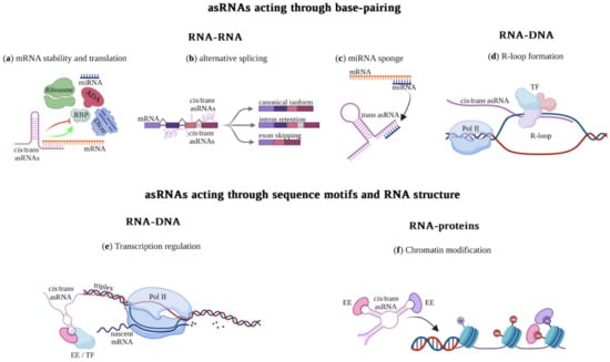RNA-dependent mechanisms of asRNAs. In the figure, the different RNA-dependent modalities of asRNAs are depicted. asRNAs can act through base pairing with other RNAs by affecting the (a) mRNA stability and translation or (b) the alternative splicing of target genes; (c) they can also act as sponges to sequester miRNAs or (d) form R-loop with the DNA helix. On the other hand, asRNAs can act through sequence motifs and RNA structure, allowing them to bind to (e) DNA and (f) proteins, respectively. ADA: adenosine deaminase; RBP: RNA binding protein; miRNA: microRNA; Pol II: RNA Polymerase II; TF: transcription factor; EE: epigenetic enzyme. Created with BioRender.com accessed on 25 October 2022.