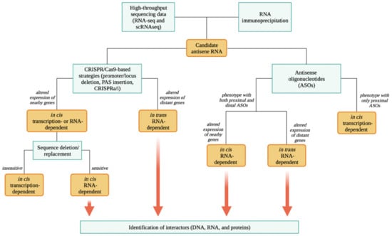 Aside from this lack of uniform classification and annotation, it is clear that asRNAs represent a multiverse of regulatory RNAs, the functions and mechanisms of action of which are very far from being completely understood. In this review, we reported the approaches that can be used to identify and functionally characterize novel asRNAs (Figure 4). Specifically, we described the potential of different manipulation approaches, mainly CRISPR/Cas9- and ASO-based methods, to assess transcription- vs. RNA-dependent mechanisms of action, as well as in cis vs. in trans function of asRNAs.