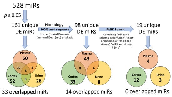 miRNA selection flow chart (left to right). Three criteria thresholds were set for the 528 assayed miRs to filter conserved DE miRs relevant to ischemia-reperfusion injury studies. (1) All miRs with a p-value > 0.05 were excluded; 161 unique DE miRs were significantly and differentially expressed following IRI. (2) Based on their seed sequence, only 98 unique DE miRs 100% (seed sequence and polarity) matched to human, mouse, and rat genomes. In the final filter, PubMed was searched for studies involving these 98 miRs and IR injury, identifying 19 examples.