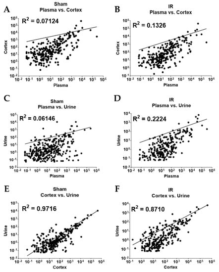 Correlation of miRNA abundance in CPM in DE miRs that appear in two samples from ischemia- reperfusion injured rats compared to sham-operated rats. miRs present in two sample types from both sham and IR groups were analyzed for correlation (R2), respectively. (A,B) Plasma vs. Cortex; (C,D) Plasma vs. Urine; and (E,F) Cortex vs. Urine.