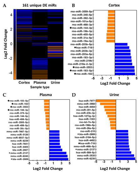 Significantly and differentially expressed miRNAs in samples from ischemia-reperfusion injured rats compared to sham-operated rats. (A) Heat map showing 161 DE (adj. p value < 0.05) miRs following 30 min of ischemia and 24 h of reperfusion compared to sham-operated controls; each row represents an individual miR and its log2fold-change in abundance within cortex, plasma, and/or urine samples. Ten miRs with the highest log2fold-change increase or decrease in abundance in IR vs. Sham comparison within (B) cortex, (C) plasma, and (D) urine samples. Orange = decreased and blue = increased. ◆ = miR present in cortex and plasma samples; ★ = miR present in cortex and urine samples; and ● = miR present in plasma and urine samples.
