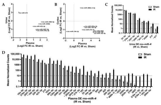 Analysis of miRs with 100% seed region homology (conserved) between rats, mice, and humans. Several DE miRs were identified in both (A) urine and plasma samples, and (B) cortex and plasma samples, with log2 fold-change IR vs. sham plotted for each miR and sample type. Points represent the mean value for each miR, within the study group. The relative abundance of conserved miRs that were significantly increased in IR vs. sham comparisons for (C) urine and (D) plasma samples. Mean ± SEM. For (C), # designates increased in IR plasma and * designates decreased in IR plasma. For (D), # designates increased in IR cortex and * designates decreased in IR cortex. All miRs presented had an adj. p value < 0.05 in IR vs. sham comparison, n = 7 IR and n = 5 sham.
