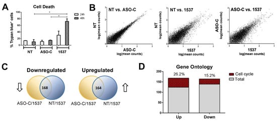 Figure 1. Transcriptomic analysis of MDA-MB-231 cells after knockdown of ASncmtRNA. Cells were transfected with 200 nM ASO-C or Andes-1537 or left untreated. (A) A representative experiment showing cell death measured by Trypan blue incorporation at 24 and 48 h. Andes-1537-treated cells displayed significantly higher % of death at 48 h, compared to both controls. The RNA samples used for sequencing were extracted from cells treated in this manner for 24 h in order to detect early events. * p < 0.05. (B) Dispersion plots showing a comparison between all conditions of total gene expression expressed in TPM. (C) Venn diagrams showing common downregulated (left) and upregulated (right) genes between NT vs. 1537 and ASO-C vs. 1537. (D) Gene ontology analysis revealed that an important proportion of differentially expressed genes were cell cycle related.
