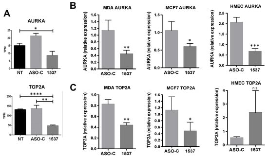 Figure 2. Relative expression of AURKA and TOP2A mRNA upon ASncmtRNA KD. (A) Relative abundance of mRNAs in the MDA-MB-231 transcriptome, expressed as transcripts per million (TPM), for the three conditions. These results were validated by RT-qPCR in the same cell line, the MCF7 line, and normal primary breast epithelial cells (HMEC), after a 24 h treatment. (B) AURKA mRNA is downregulated in all three cell types. (C) TOP2A was significantly downregulated in both tumor cell lines but not in HMECs. In (B,C), results are plotted relative to NT cells. * p < 0.05, ** p < 0.01, *** p < 0.001, **** p < 0.0001, n.s. non-significant.