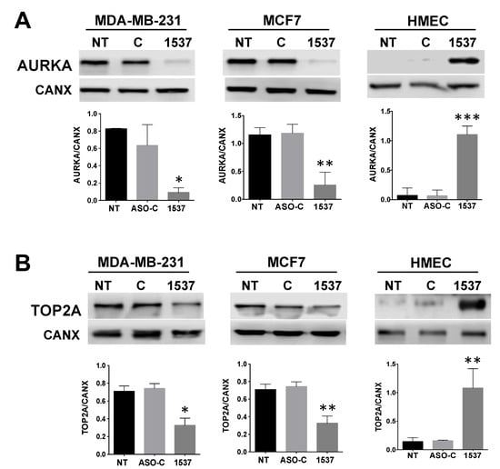 Figure 3. Protein expression of AURKA and TOP2A after ASncmtRNA KD for 24 h in MDA-MB-231, MCF7, and HMEC cells. (A) AURKA expression shows a strong downregulation in tumor cells and a strong upregulation in normal HMEC cells transfected with Andes-1537, compared to the controls. (B) TOP2A protein is reduced by half after ASncmtRNA KD in both tumor cell lines, while it increases by around 7 times in HMECs. * p < 0.05, ** p < 0.01, *** p < 0.001.