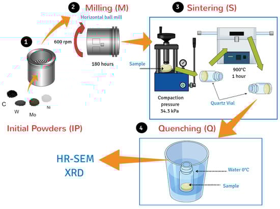 W (98.9% purity, 5 ± 2 m), Mo (99.8% purity, 25 ± 3 m), Ni (99% purity, 50 ± 2 m) and C (99.8% purity, 11 ± 3 m) from Sigma Aldrich Company were used as raw materials and carbide precursors. The initial composition of the powders was as follows: W: 10 wt.%; Ni: 15 wt.%; Mo: 25 wt.%; and C: 50 wt.%. The raw materials underwent 180 h of continuous mechanical alloying in a horizontal noncommercial low-energy ball mill instrument at a rotational speed of 600 rpm (180 h of continuous milling). The initial powders and media milling were loaded into a stainless steel vial inside a vacuum glove box under argon atmosphere. Cylindrically shaped high-density ZrO zirconia grinding media with two sizes, 12.7 mm × 12.7 mm and 9.5 mm × 9.5 mm, were used. The ball-to-powder weight ratio was 10:1. The synthesized powders were compacted on a stainless steel die at a pressure of 34.3 kPa to produce a compacted sample with a cylindrical shape, thickness and height of 2 mm and 5 mm, respectively. The sample tablet was introduced into a quartz vial sealed with argon atmosphere and placed into a TF55030A-1 tube furnace (Thermo Scientific Company, Waltham, MA, USA) heated to 900 °C at a rate of 20 °C per minute for 1 h. Then, the quartz vial (with sample inside) was quenched in water at 0 °C with a cooling rate of 29.16 °C/s.