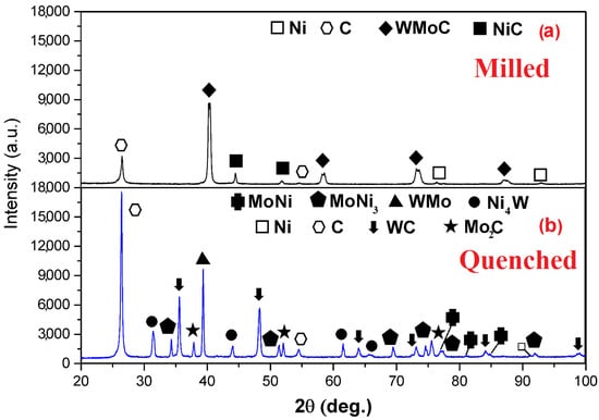 Figure 2a shows X-ray diffraction (XRD) results for the sample milled at 180 h. The obtained phases were C, Ni, WMoC, and NiC. Figure 2b shows the X-ray diffraction (XRD) pattern of the quenched NiWMoC powders. The results revealed the presence of MoNi, WMo, NiW, WC, MoNi and MoC. Some of the diffraction peaks observed for the heat-treated metallic carbide powders were not detected in the corresponding XRD pattern of the sample obtained by milling (Figure 2a). This suggests the occurrence of WMoC-NiC decomposition. Previously, we prepared the same system under different synthesis conditions, and this kind of decomposition was not observed [,], indicating that the crystal deformation conditions used in this work, namely 180 h of milling, followed by sintering, heat treatment, and quenching, supply the energy for the decomposition of the milled phases and therefore the formation of new phases during sintering and quenching. Table 1 summarizes the crystallographic data of the phases obtained by mechanical milling and quenching.