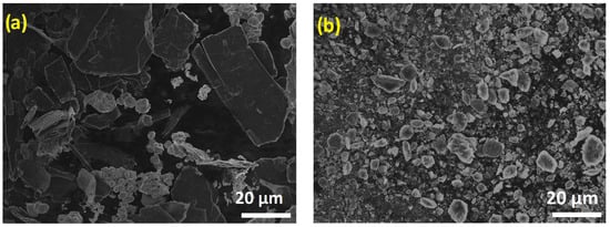 Figure 3a presents the SEM images showing the morphology of the unmilled sample. The characteristic morphology of the initial powder was flake-like with an average size of 18 µm. After milling for 180 h, the powder particle size decreased considerably due to work hardening and fracture via a fatigue mechanism []. An average particle size of approximately 4 µm was obtained after 180 h of milling (Figure 3b).