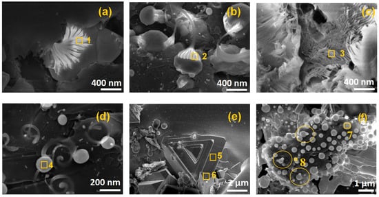 Figure 4 shows the SEM micrographs of the quenched sample. Phase separation due to a decomposition mechanism in a flake-like carbide is shown in Figure 4a. The dark flake-like shape corresponded to the carbide phase, while the bright branch-shaped structure corresponded to the intermetallic MoNi phase based on the chemical composition of this region. The results of the EDS point chemical analysis from the yellow selected area Figure 4a are presented in Table 2 (Spot 1). This region had an atomic composition of 73.34 at.% Ni, 22.98 at.% Mo, 2.67 at.% C, and 0.98 at.% W with slight oxidation. It must be noted that decomposition was related to a spontaneous separation of phases, and the interdiffusion process increased when the phases interacted with each other. This interaction can be attributed to the mechanical energy produced by mechanical alloying (MA) that leads to the deformation process in the powder particles during the mechanosynthesis process according to the literature []. Then, the formation of stable nuclei and their boundaries is forbidden, leading to the formation of a branch-shaped structure. Branched structures are formed when an energy gradient affects a specific region of the separated phase by decomposition that leads to regions rich in one phase intercalated with regions rich in another phase [,]. Figure 4b shows the formation of globular carbide particles with the diameters of approximately 500 nm (darkest zone). In these particles, decomposition and the formation of nanotubes were observed. Under the tubes, a branched bright pattern was observed. However, in one of these particles, instead of branched structures, the bright regions had a “petal-like”shape, which is probably evidence of a decomposition mechanism [].