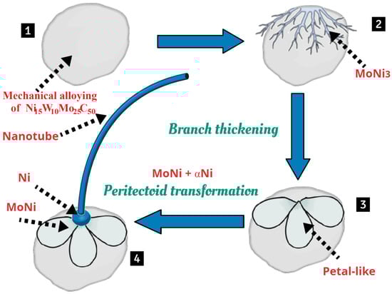Figure 5 shows the evolution of the phases and the formation of the petal-like structure of NiMoWC after quenching. Examination of SEM images suggests that the transformation mechanism for the production of these petal-like structures can be proposed as follows: (1) production of WMoC-NiC-Ni-C (Table 1) with flake-like morphology during mechanical alloying of NiMoWC at 180 h (see Step 1 in Figure 5); (2) formation of the MoNi intermetallic phase caused by a decomposition mechanism (see Step 2 in Figure 5); (3) branch thickening of the MoNi intermetallic to produce the petal-like structure (see Step 3 in Figure 5); (4) transformation of MoNi to MoNi + Ni caused by peritectoid decomposition in addition to the nanotubes emerged from this particle due to the repulsion between the intermetallic phase and carbon (see Step 4 in Figure 5). If we compare EDS elemental composition (shown in Table 2) against the Mo-Ni phase diagram during heating process [], the MoNi phase tends to move to the MoNi + Ni region; therefore, XRD results confirm the presence of these decomposed phases (see Figure 2b and Table 1). Isostructural transformation is an important characteristic during the decomposition mechanism; it is evident that none of the phases identified after mechanical alloying or quenching correspond to the parent of the MoNi phase (as observed in Table 1). This behavior is due to an intermediate parent phase (which is unknown), which was produced between the sintering and the quenching process. We think that potential applications of the samples observed in this work can be extended to additional catalysts if the preparation of these materials is properly controlled. For example, in Figure 4b, the petal-like structured particle has a modulated ferromagnetic MoNi phase on its surface. These petal-like structures are separated from each other and resemble commutators of direct current (DC) in motors and generators. It is possible that when introduced into a magnetic field, this particle rotates and acts as a motor and can act as a generator. This application may be attractive for use in generator/motor microelectromechanical systems MEMS [].